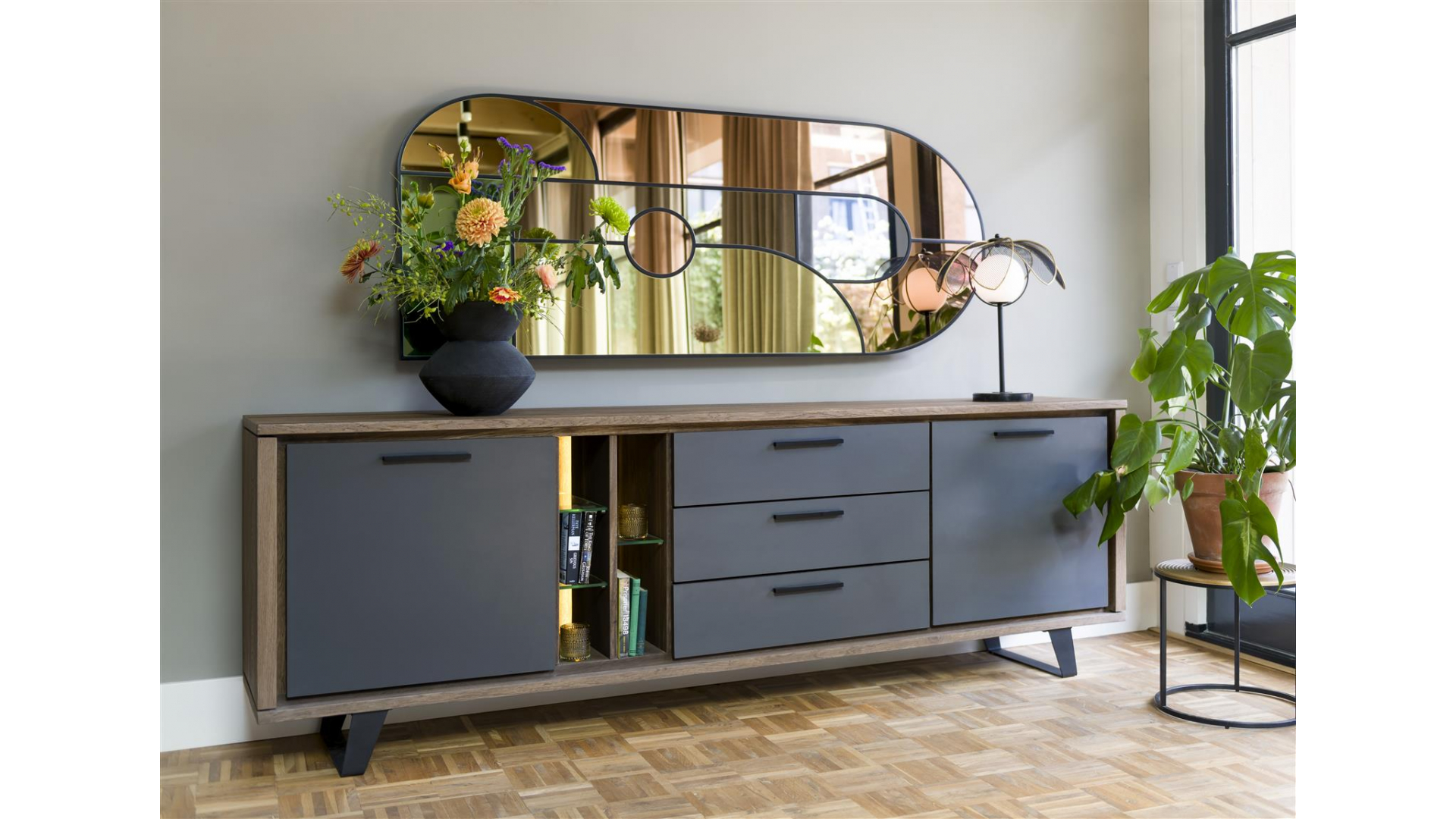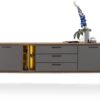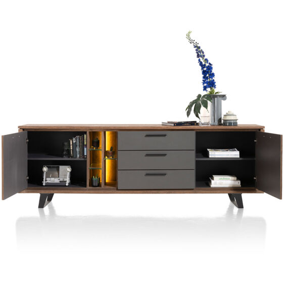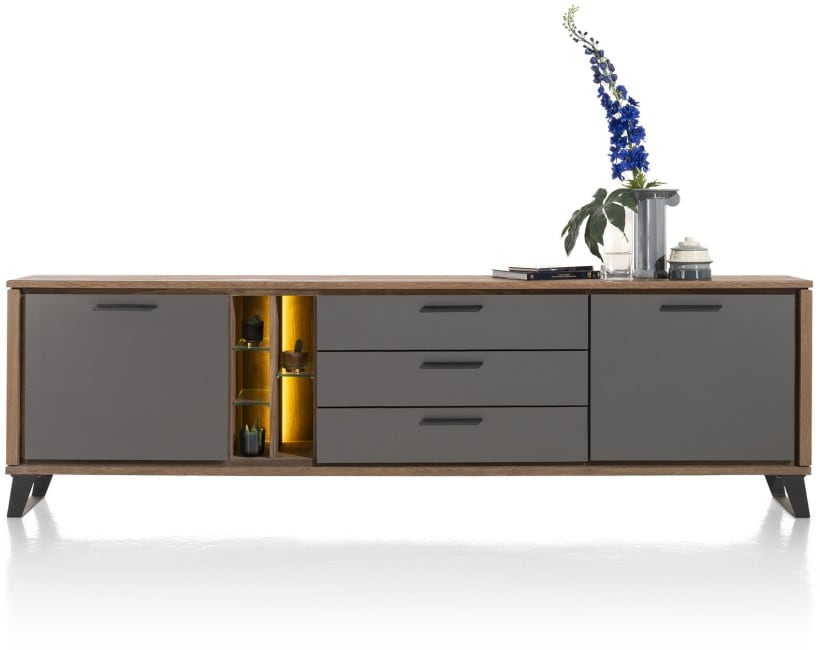 Komoda wykonana z drewna dębowego w odcieniu dąb palony.Charakteryzuje ją nowoczesny design i atrakcyjny, ciepły wygląd. Posiada 2 drzwi, 3 szuflady i 5 otwartych przegródek. Fronty komody zostały wykonane z trwałego materiału HPL w kolorze antracytowym. Wyposażona jest w metalowe uchwyty oraz nogi, a otwarta półka w nastrojowe oświetlenie LED.