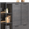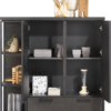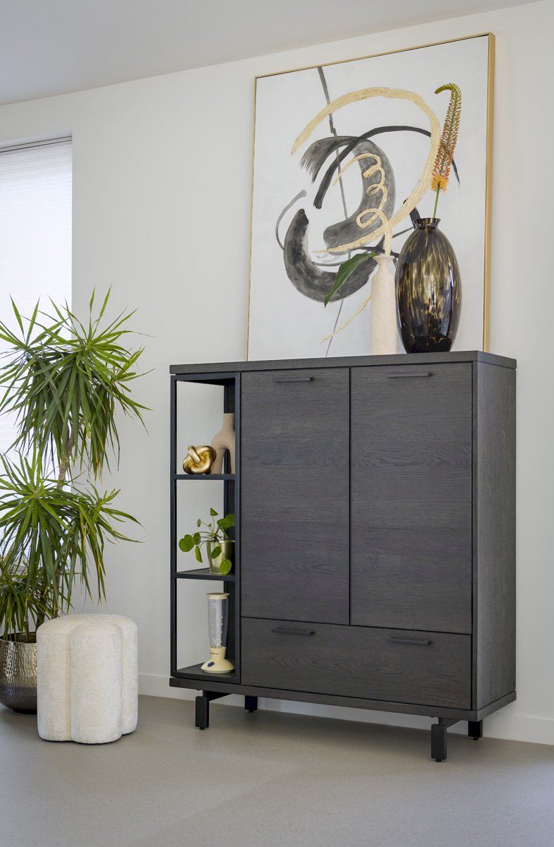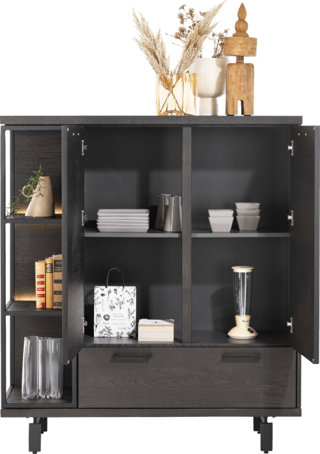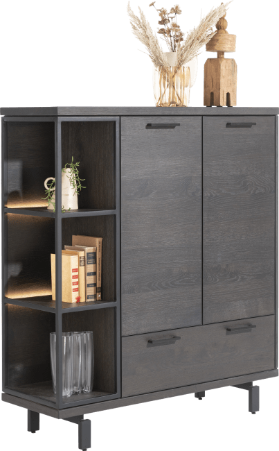 Komoda wysoka wykonana z drewna dębowego w kolorze czarnym zapewnia dobrą równowagę między przechowywaniem a ekspozycją, z otwartymi przegrodami z oświetleniem LED i szafkami do przechowywania. Piękna struktura naturalnego drewna, widoczne słoje oraz sęki.