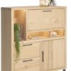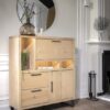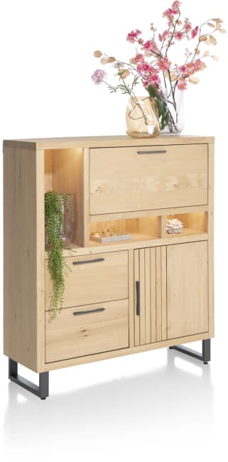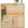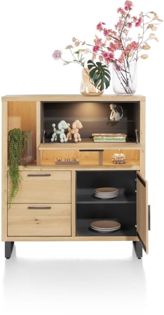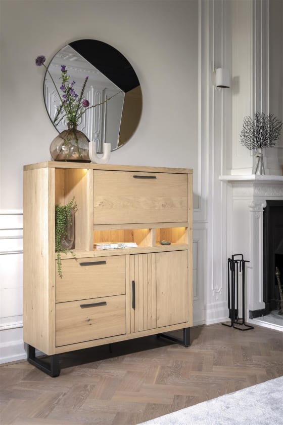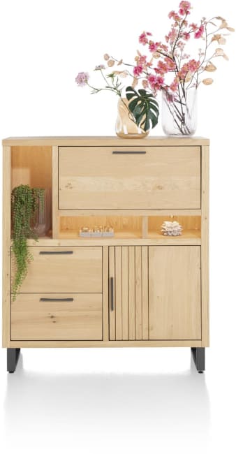 Komoda wykonana z drewna dębowego w naturalnym kolorze. Ta wersja najlepiej pasuje do naturalnego wnętrza. Mebel posiada 2 szuflady, duże drzwi szafki o konstrukcji lamelowej oraz 3 otwarte przegródki na dekoracje lub drobne przedmioty.