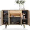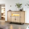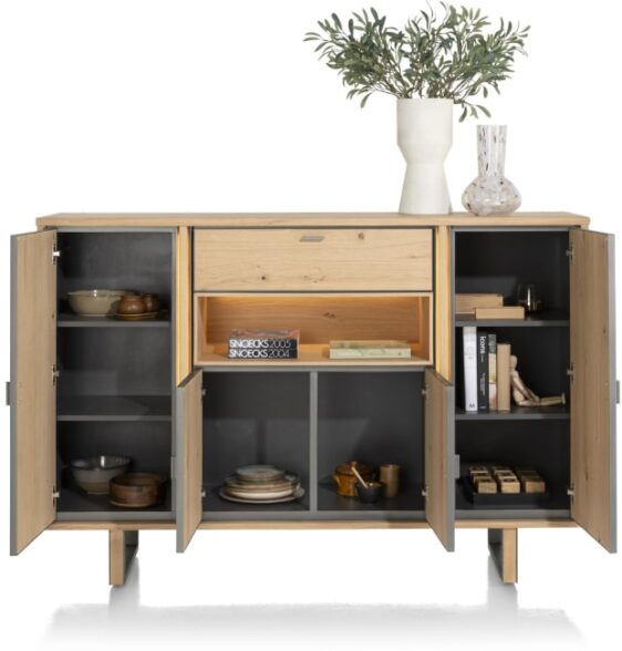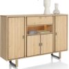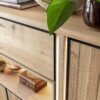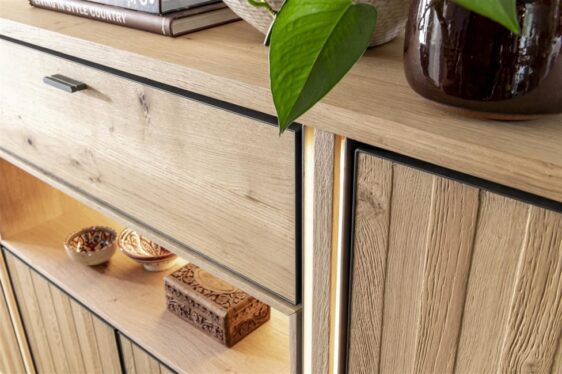 Komoda wysoka Shimanto, wykonana z drewna dębowego, wzbogacona metalowymi akcentami w kolorze czarny mat. Piękna struktura naturalnego drewna, widoczne słoje oraz sęki. Naturalne pęknięcia zostały zaakcentowane czarnym wypełnieniem.