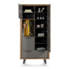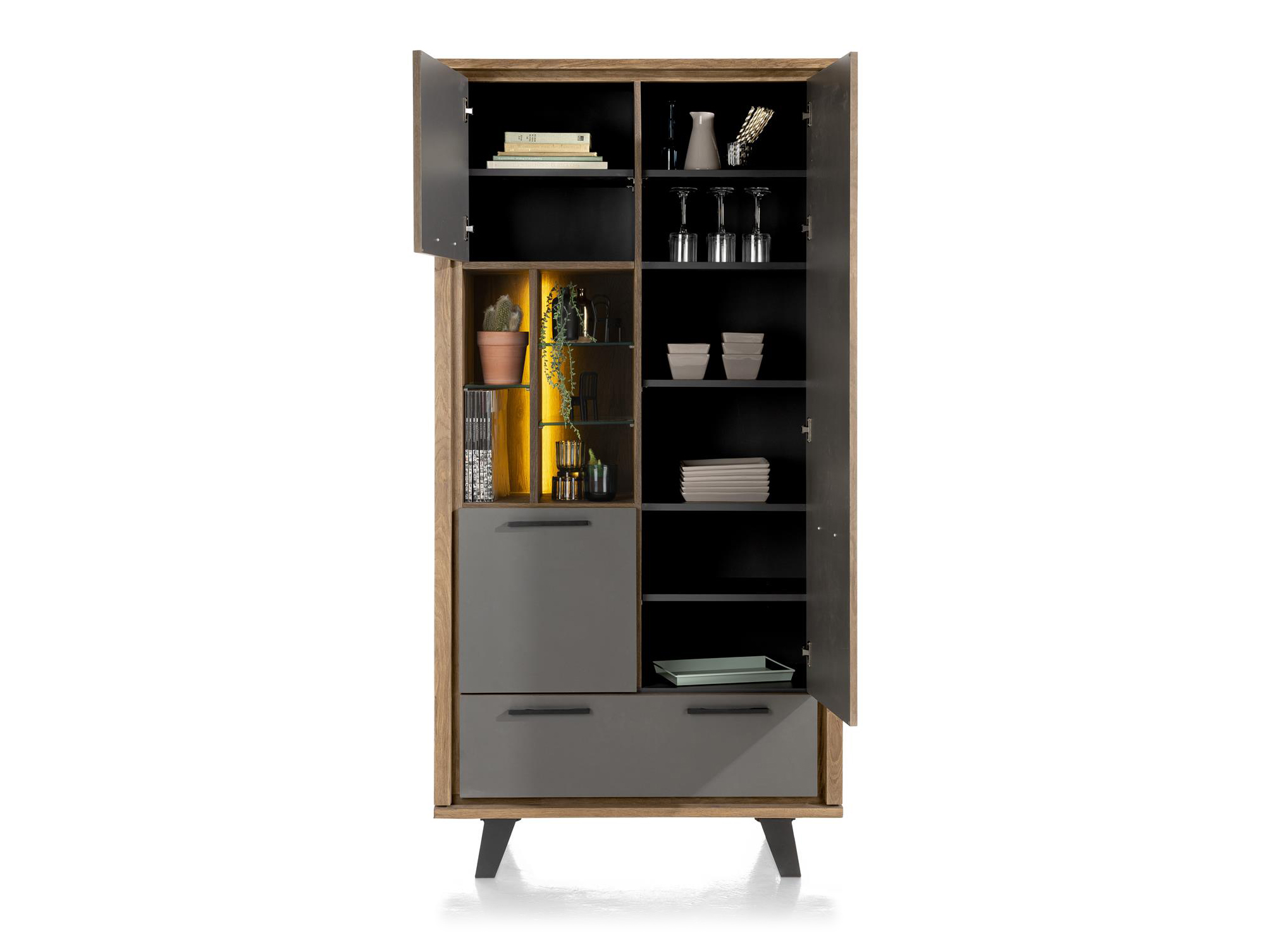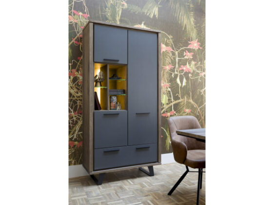 Kredens wykonany z drewna dębowego w odcieniu palonym, wzbogacona metalowymi akcentami w kolorze antracytowym. Elegancka, nowoczesna gra linii z zabawnymi wpływami retro. Fronty wykonane są z materiału HPL w kolorze antracytowym. Oprócz pięknego designu, ten kredens oferuje również wystarczającą ilość miejsca do przechowywania. W tej centralnej, otwartej przestrzeni świeci ciepłe i nastrojowe światło LED.