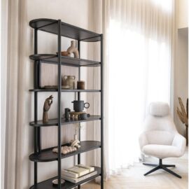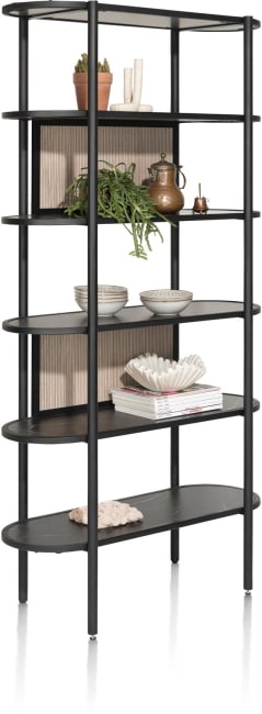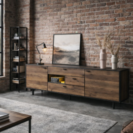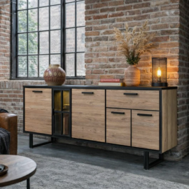 Witryna została wykonana z Primo Laminato, wysoce odpornego na zarysowania materiału o wyglądzie naturalnego drewna. Dobrze komponuje się z metalowymi nogami, ramami wokół szuflad. Przeszklona witryna wyposażona jest w oświetlenie LED.
