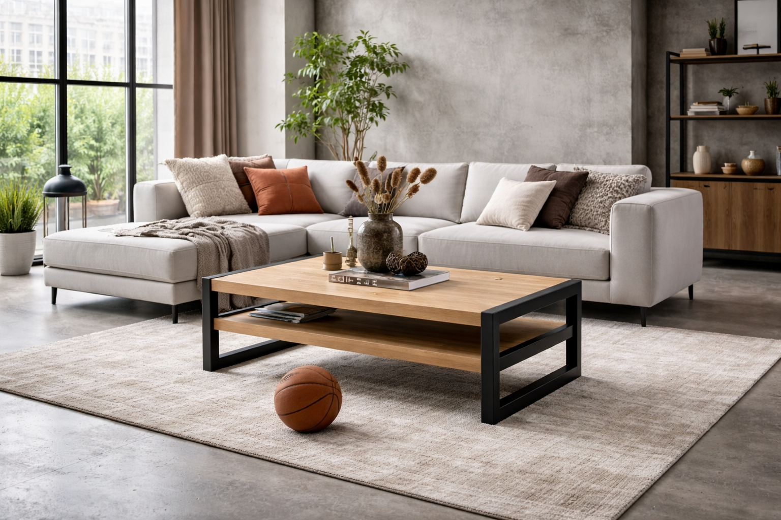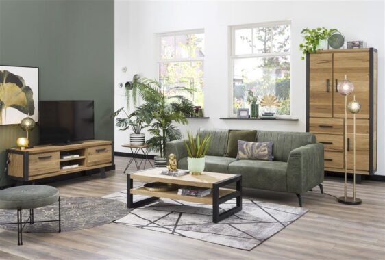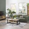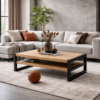 Stolik kawowy wykonany z drewna dębowego, wzbogacony metalowymi akcentami w kolorze czarny mat.