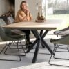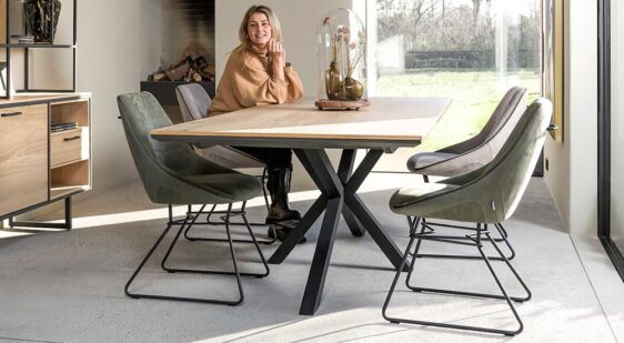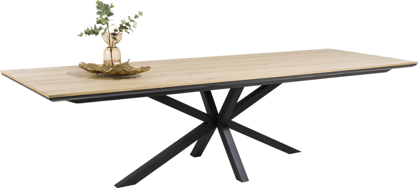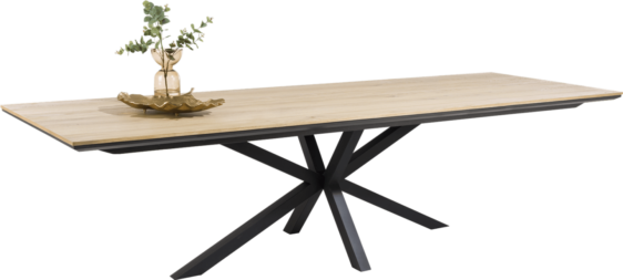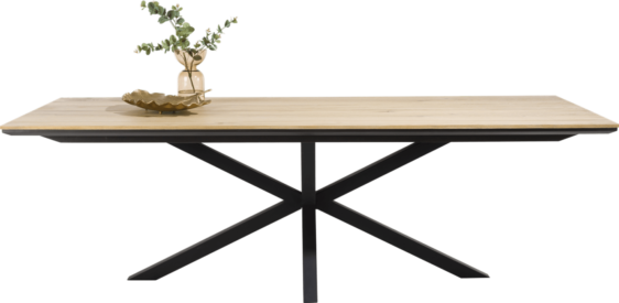 Stół wykonany z naturalnego forniru dębowego, o jasnym naturalnym odcieniu. Nogi wykonane są z metalu w kolorze czarny mat.