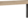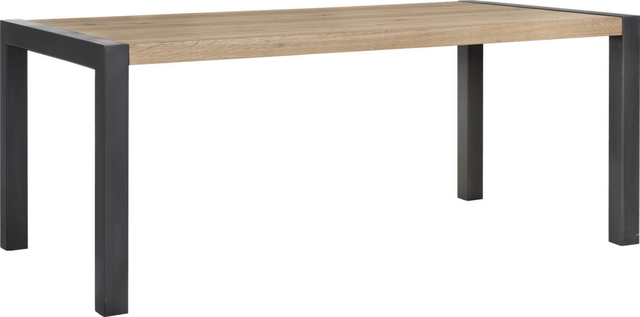 Ten solidny stół do jadalni ma piękny dębowy blat o naturalnej strukturze. Widoczne słoje oraz sęki, a naturalne pęknięcia zostały zaakcentowane czarnym wypełnieniem.Uwagę zwracają metalowe nogi stołu w kształcie litery U. Połączenie drewna i metalu nadaje temu stołowi do jadalni solidny, nowoczesny wygląd.