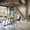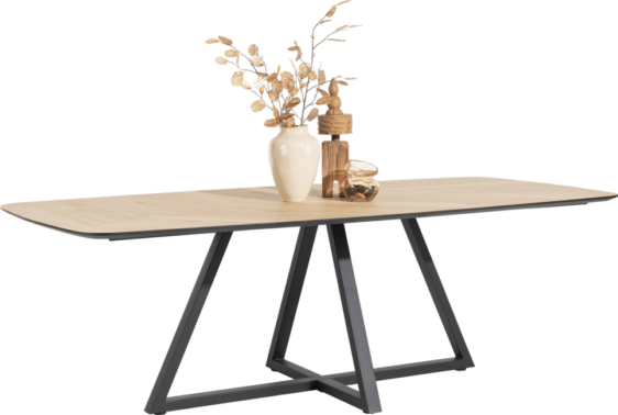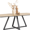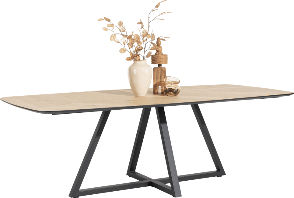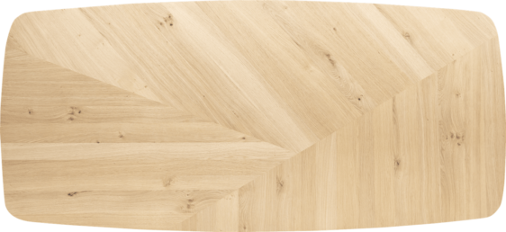 Ten duży stół do jadalni ma nie tylko piękny owalny kształt z zaokrąglonymi rogami, ale ma również efektowną środkową nogę poprzeczną i mozaikowy wzór. Blat wykonany jest z drewna dębowego ze świeżym, naturalnym kolorem drewna. Ta wersja ma 240 cm.