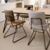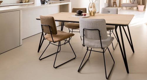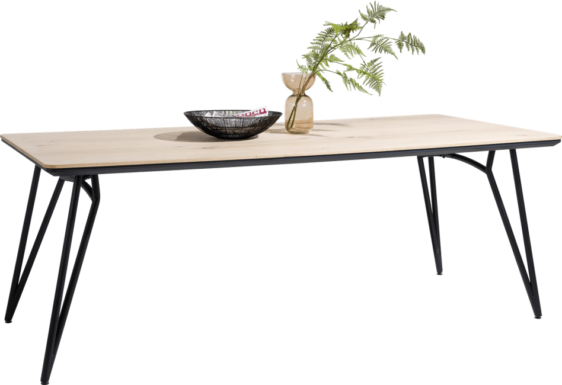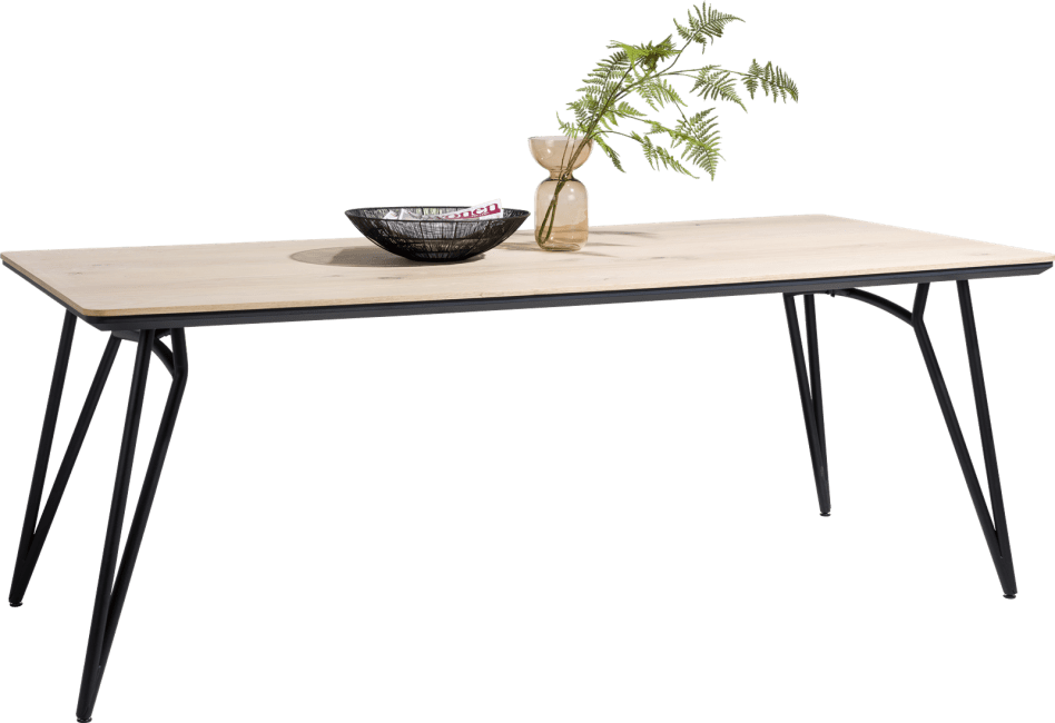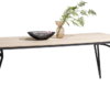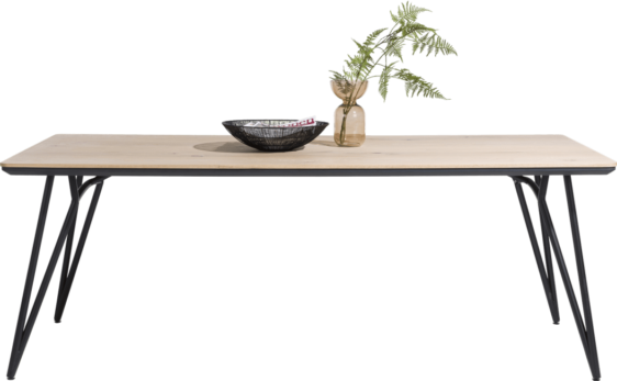 Stół wykonany z drewna dębowego, o naturalnym jasnym odcieniu. Oryginalne metalowe nogi nadają całości lekkości. Piękna struktura naturalnego drewna, widoczne słoje oraz sęki.