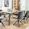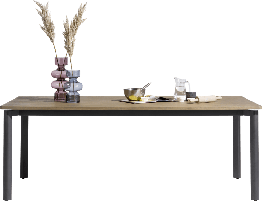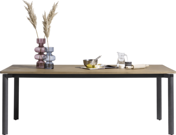 Stół wykonany z akacji na metalowych zaokrąglonych nogach w kolorze antracytowym. Piękna struktura drewna, widoczne słoje oraz sęki.