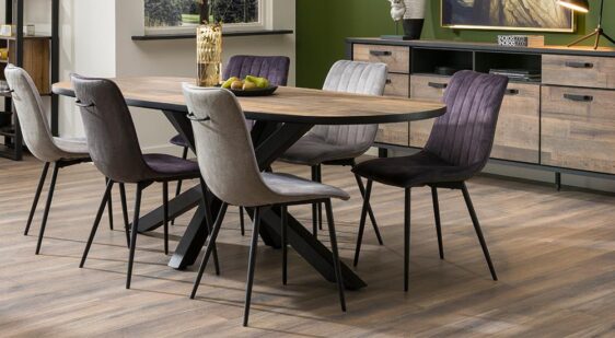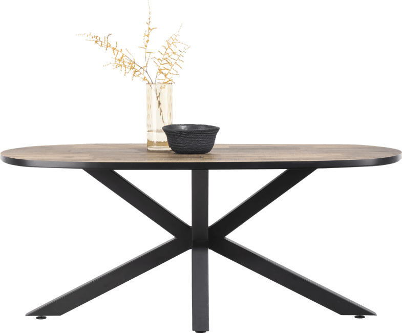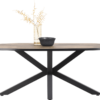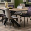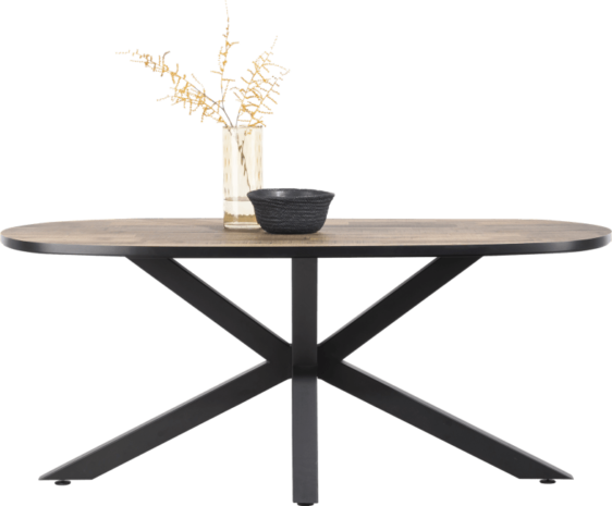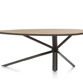 Stól owalny na metalowej nodze w kolorze czarny mat. Blat z zaokrąglonymi narożnikami i metalową krawędzią oraz konstrukcja nogi stołu nadaje mu nowoczesnego designu. Tafla stołu wykonana jest z HPL, mocnego materiału o wyglądzie drewna. Do wykończenia wybrano kolor Driftwood.