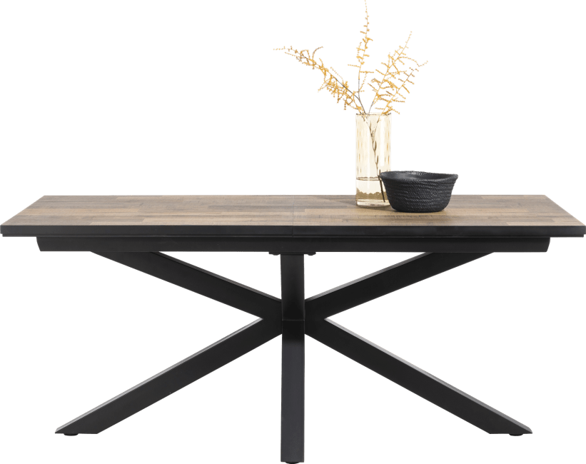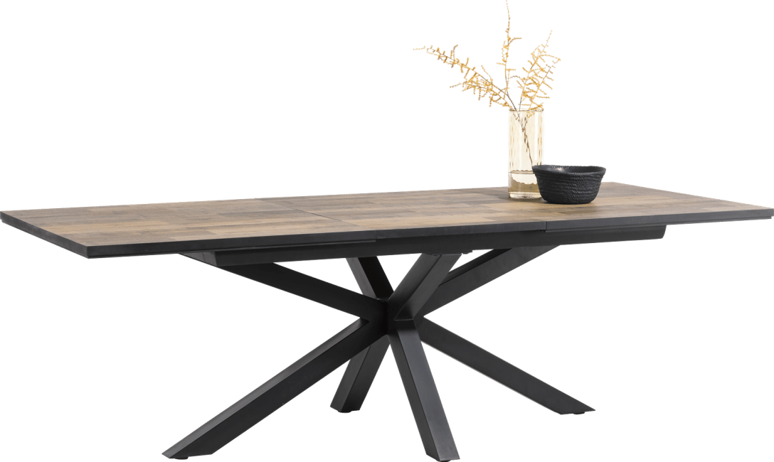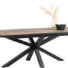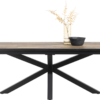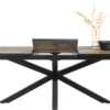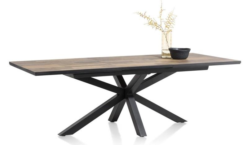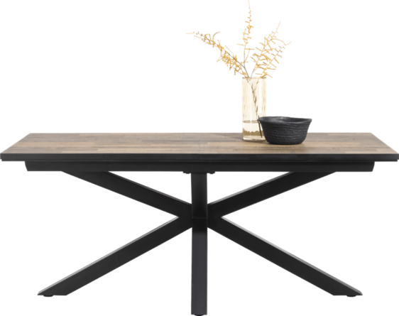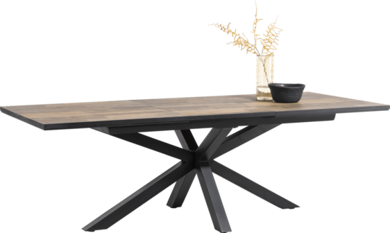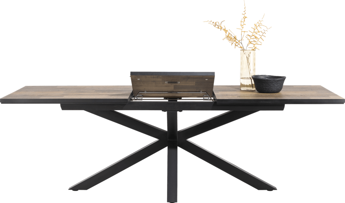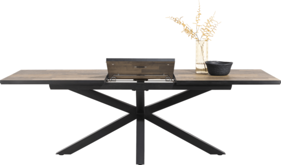 Stół rozkładany na czarnych metalowych nogach. Blat stołu wykonany jest z HPL, mocnego i łatwego w utrzymaniu materiału o wyglądzie drewna. Wygląd drewna podkreśla wykończenie w kolorze driftwood. Konstrukcja stołu wykonana jest z litego drewna egzotycznego. Wyposażony w wysokiej klasy system rozkładania “Butterfly” – ciągnąc za jedną stronę tafli, rozsuwa się dostawka umieszczona na stałe pod taflą.