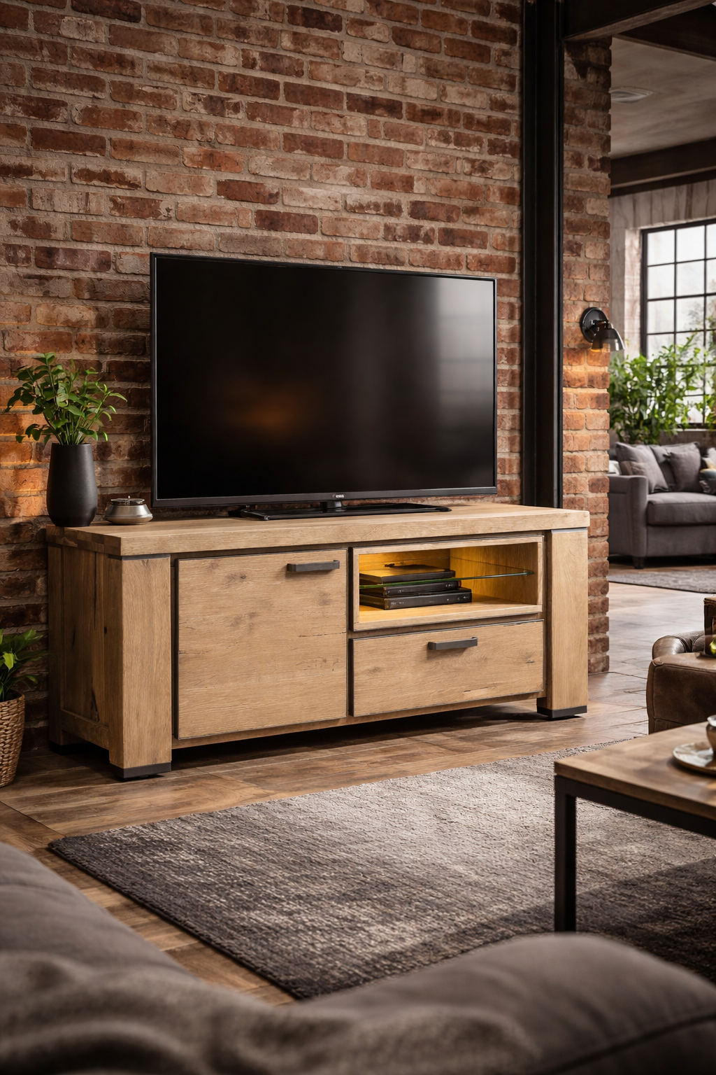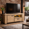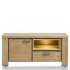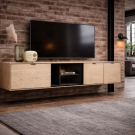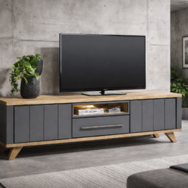 Szafka pod telewizor wykonana z drewna dębowego, wzbogacona metalowymi akcentami w kolorze antracytowym.Wykonana z drewna dębowego i zachwyca ponadprzeciętną jakością materiału i wykonania oraz niepowtarzalnym designem. Półka wzbogacona została oświetleniem LED. drzwi oraz szuflada ozdobione są metalową ramą, która przyjemnie uzupełnia całościowy obraz.