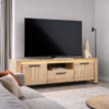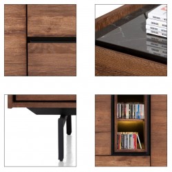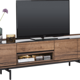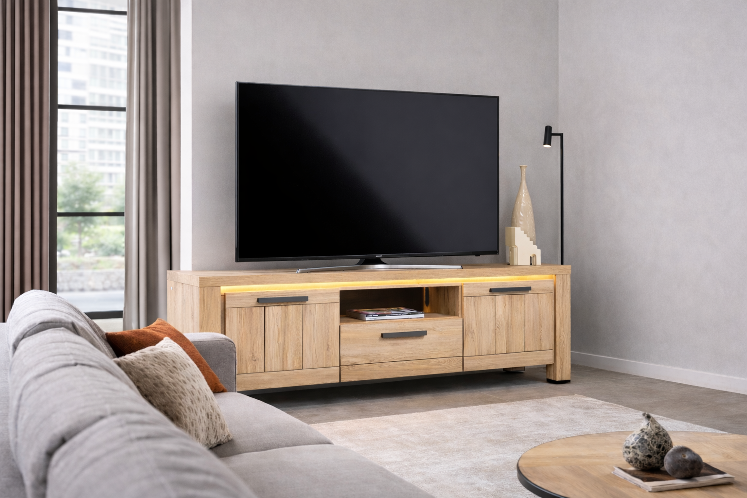 Szafka RTV Delmonte 170 cm. Ta rustykalna, naturalna kolekcja Delmonte o szerokości 170 cm i wysokości 55 cm. Kolekcja ma klasyczny wygląd dzięki listwowym drzwiom. Choć wygląda na solidną, jest wykonana z laminatu Primo Laminato (HPL), co czyni ją wyjątkowo łatwą w czyszczeniu. Mebel posiada szufladę pośrodku i drzwiczki po bokach. Jego rozmiar sprawia, że idealnie nadaje się do średniej wielkości pokojów telewizyjnych i miejsc wypoczynkowych. Zintegrowany system zarządzania kablami do urządzeń elektronicznych to praktyczny element wyposażenia. Wbudowane oświetlenie nastrojowe LED z dotykowym ściemniaczem nadaje kolekcji nowoczesny charakter.