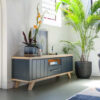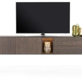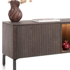Szafka RTV w kolorze antracytowym, wykończona naturalnym drewnem dębowym dla uzyskania ciepłego i stylowego wyglądu. Prezentowana komoda to idealne miejsce do umieszczenia dekoracji, książek.