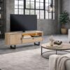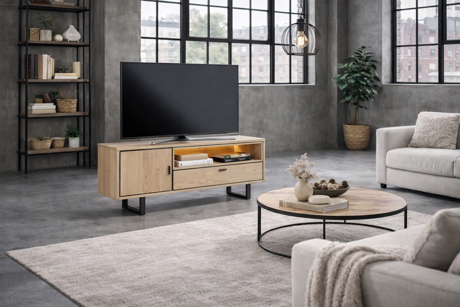 Szafka pod telewizor wykonana z drewna dębowego, wzbogacona metalowymi akcentami w kolorze czarnym.Wykonana z drewna dębowego i zachwyca ponadprzeciętną jakością materiału i wykonania oraz niepowtarzalnym designem. Półka wzbogacona została oświetleniem LED. drzwi oraz szuflada ozdobione są metalową ramą, która przyjemnie uzupełnia całościowy obraz.